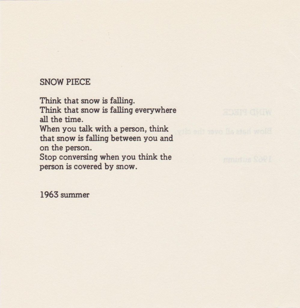 Similarly, text scores use language as a prompt for action, in the form of poetry, prose or instructions. Text scores can be conceptual – take Yoko Ono’s ‘Snow Piece’ (1963) for example, which involves imaginary actions.
