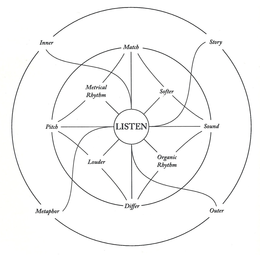 Other text scores focus on the act of listening as opposed to producing sound; this is seen in Pauline Oliveros’ Sonic Meditations (1971), which encourage unique approaches to listening with the aim of developing the performer/listener’s sonic awareness. ‘Wind Horse Mandala’ (1990) in particular demonstrates a combination of graphics and language as a form of notation.